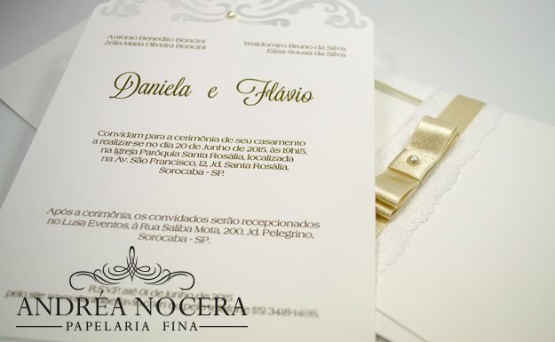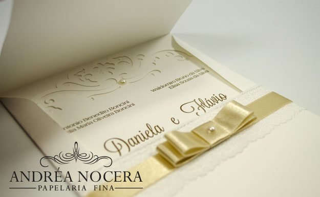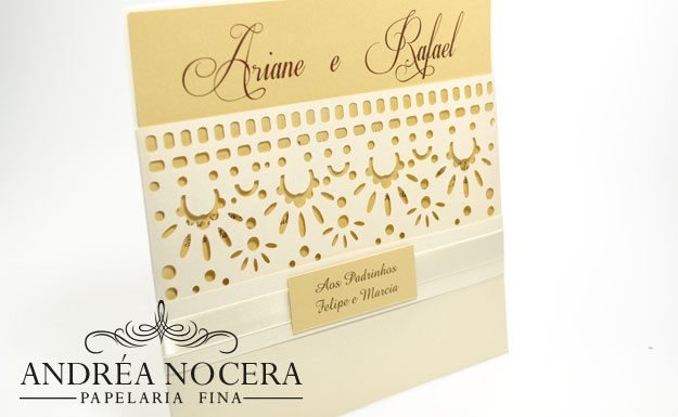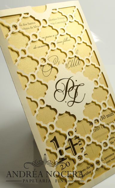 Como exemplo, podemos fazer um envelope com corte a laser, imprimir o brasão dos noivos em relevo na aba e imprimirmos o texto também em relevo.