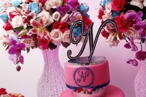 Lacre: Fita de cetim 16mm azul com laço channel duplo em rosa e azul e strass