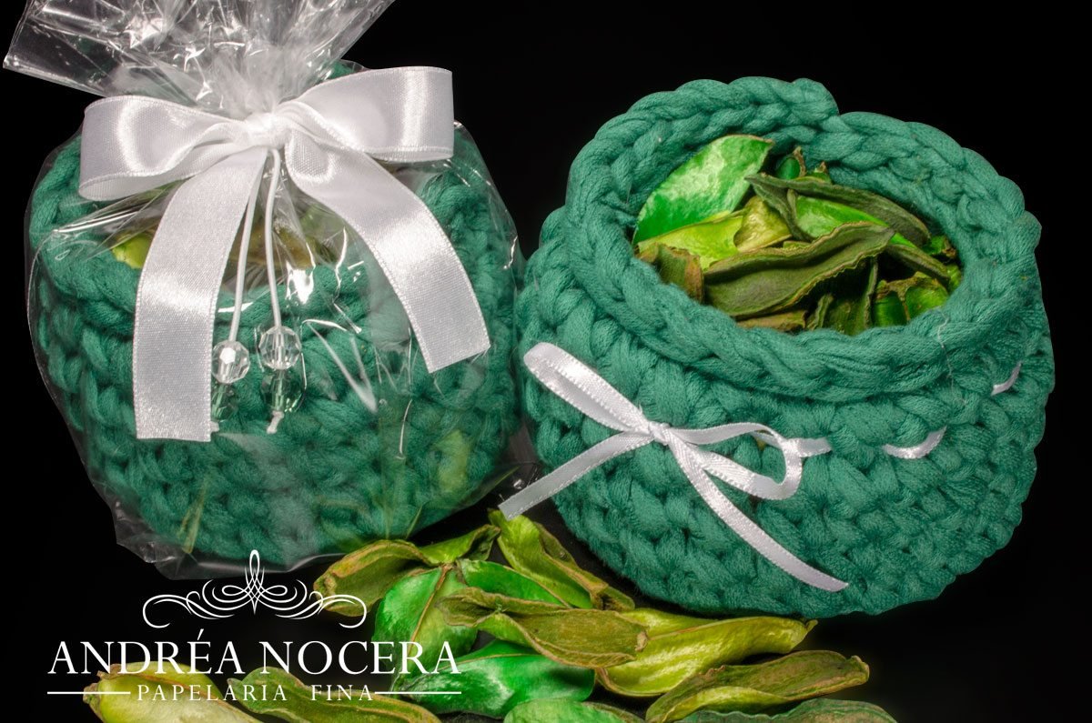 Características: Cachepot de Crochê com folhas desidratadas e aromatizadas.