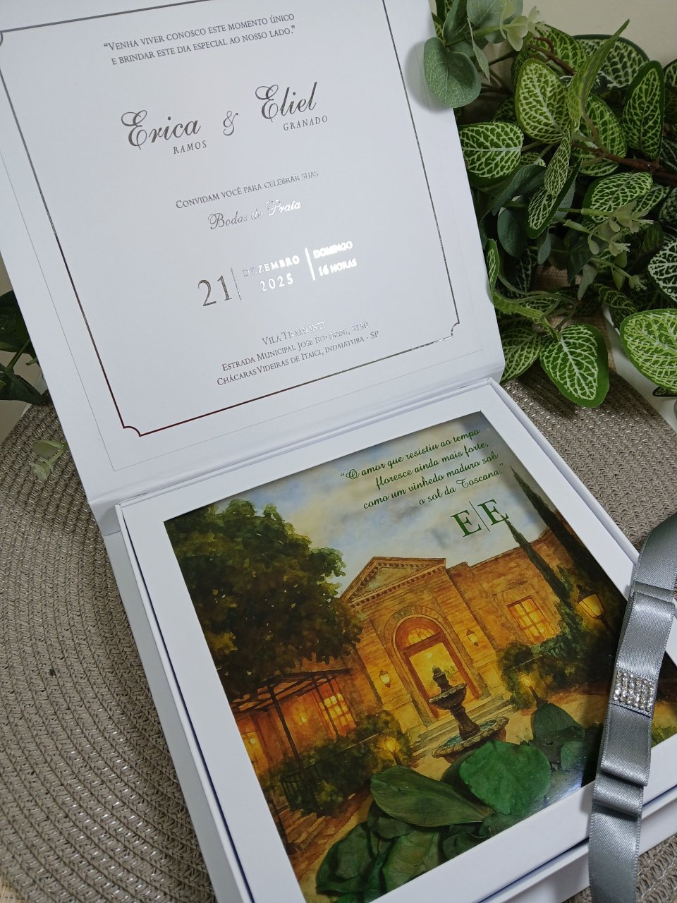 • Texto impresso em prata sobre o cartão interno, oferecendo contraste sutil e sofisticação.