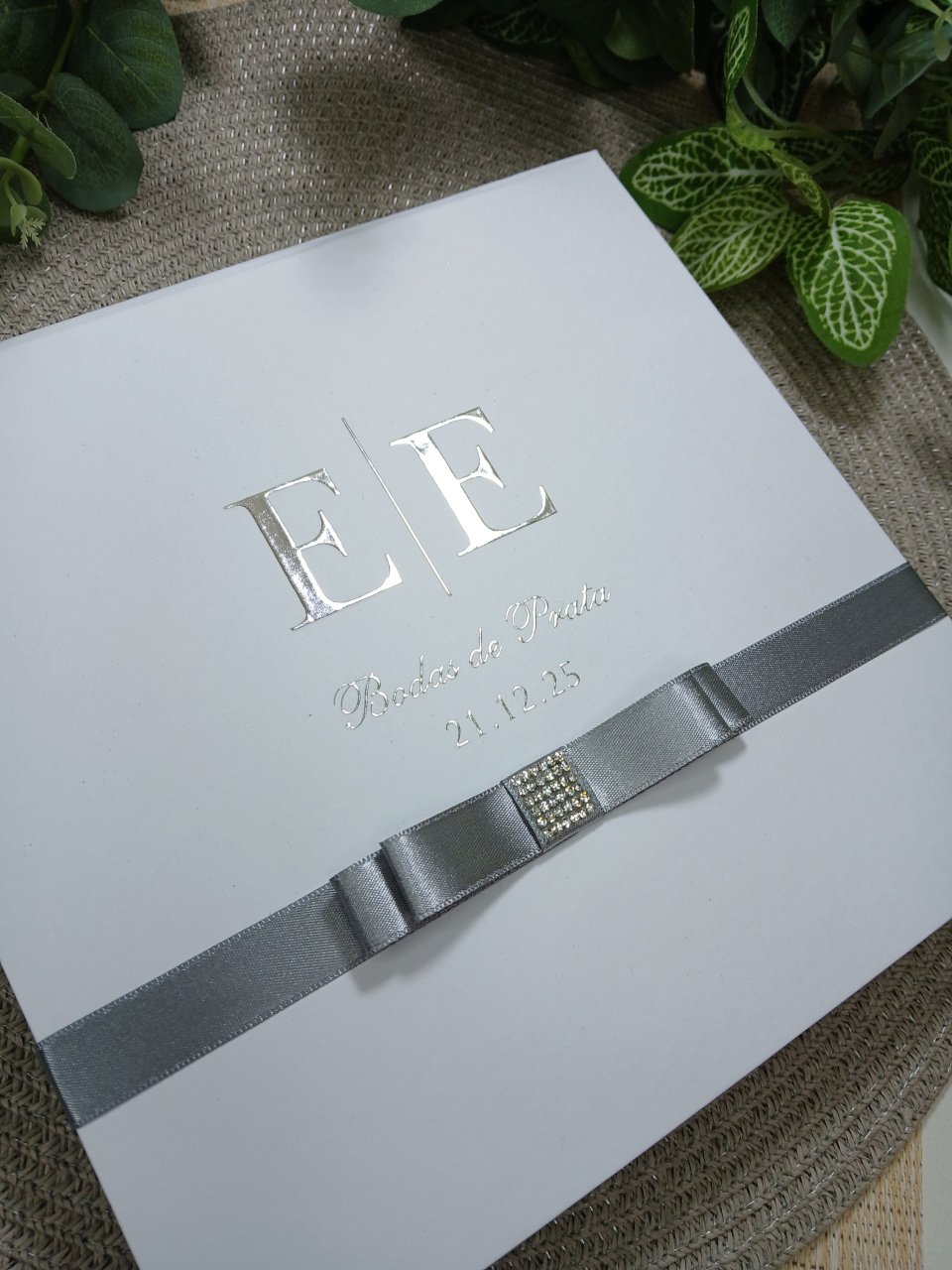 • Brasão dos noivos em prata na capa, aplicado com acabamento refinado para reforçar a identidade do casal.