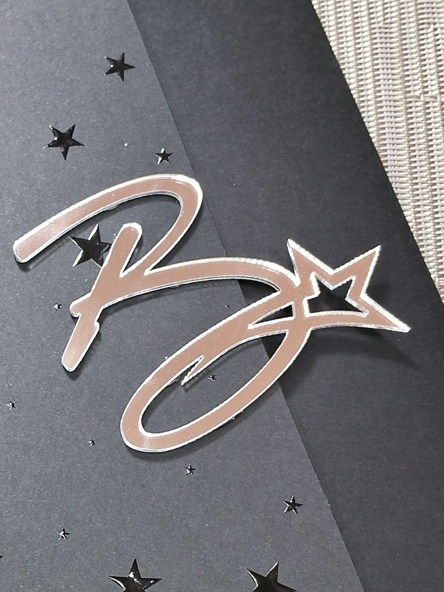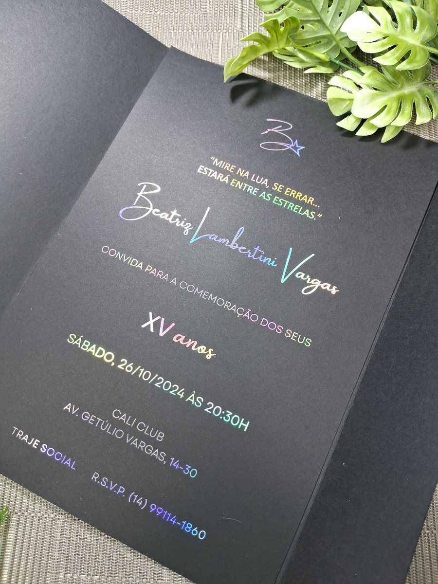 Um lindo convite de 15 anos com impressão holográfica e brasão recortado em acrílico espelhado.
