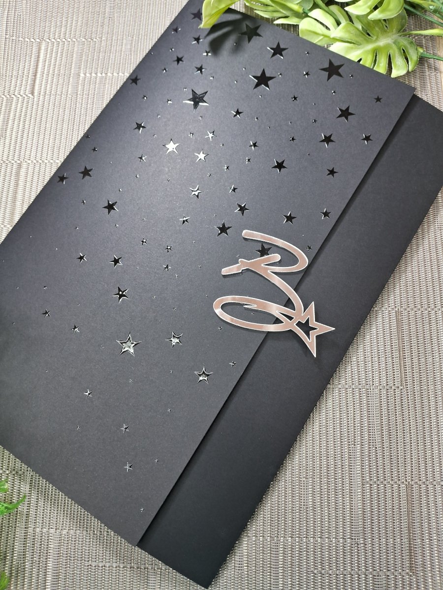 Toda a impressão do texto foi feita em hot-stamping hologáfico. Na capa, fizemos uma impressão em relevo de estrelas.