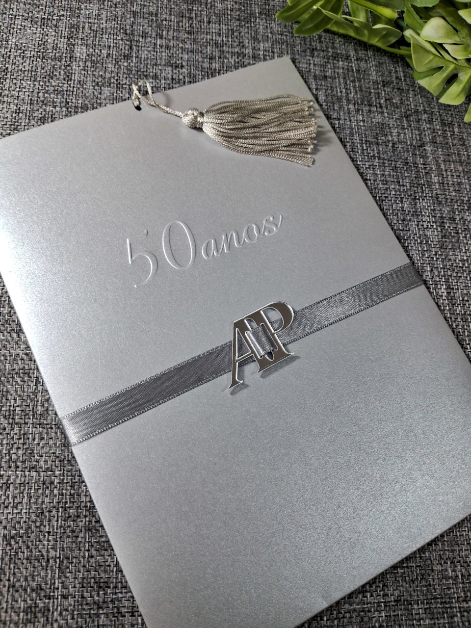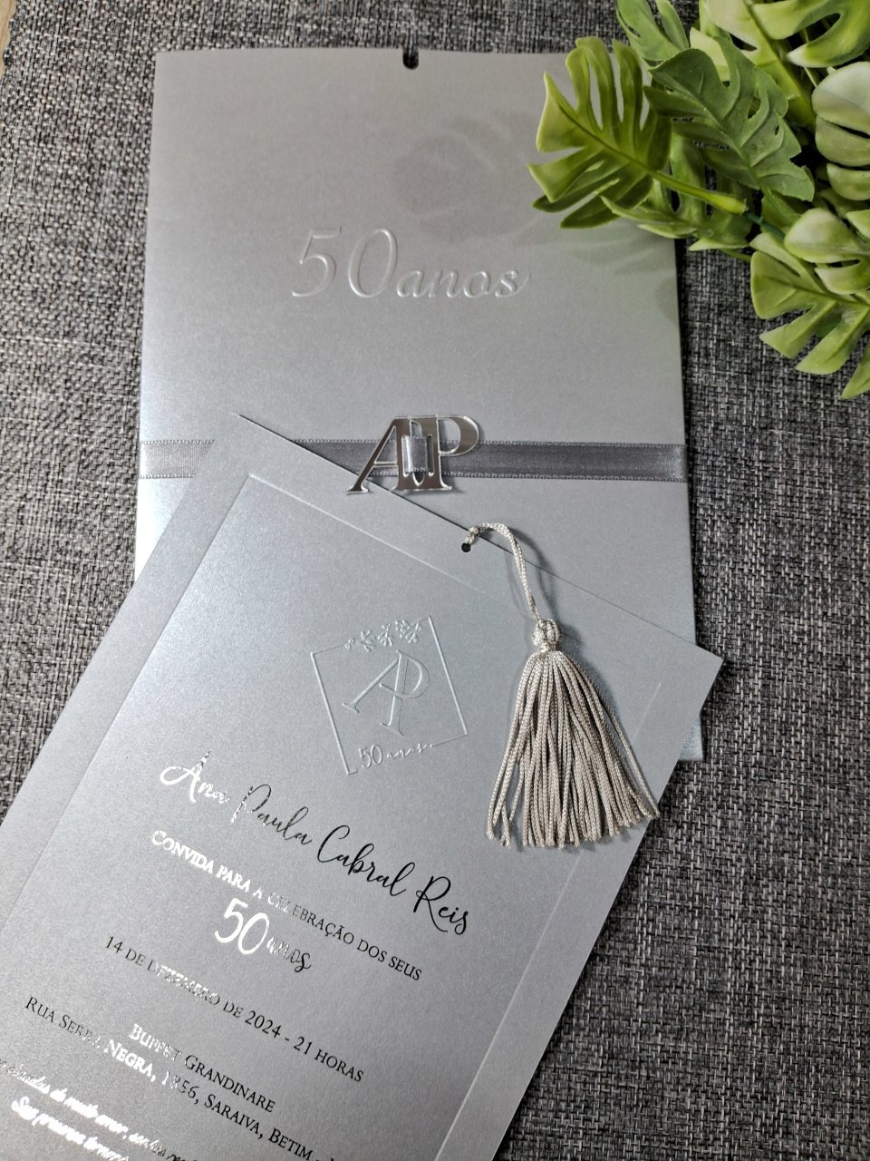 Convite de 50 anos em papel branco brilhante com detalhes em prata.