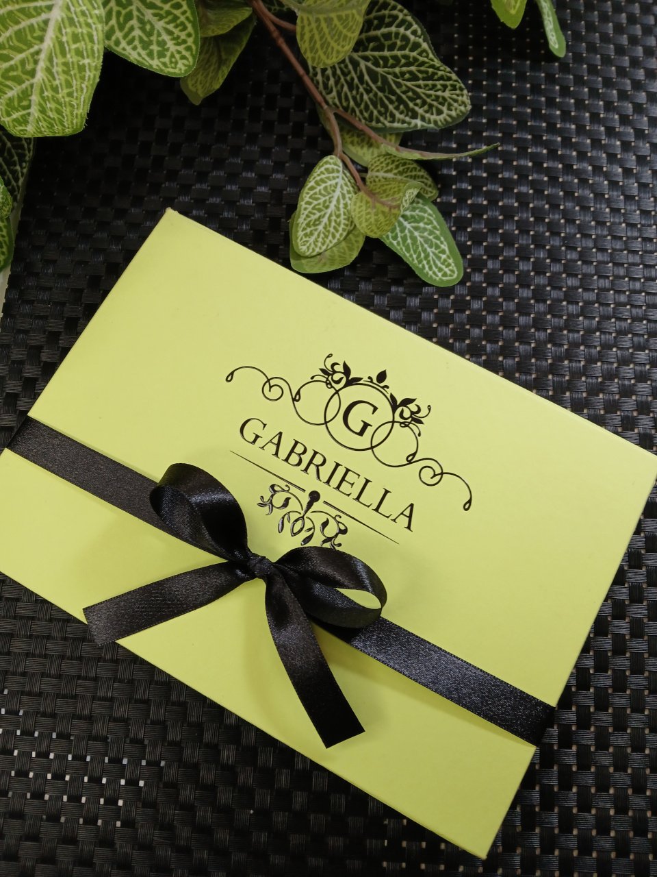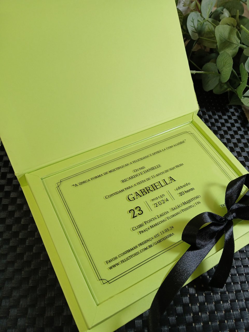 Convite cartonado de luxo para festa de debutante em papel verde com impressões em preto e texto em acetato cristal. Exclusividade e impacto visual.