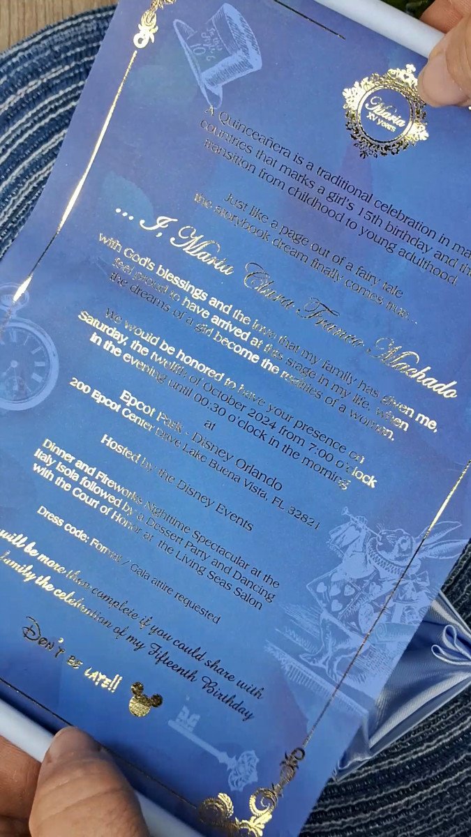 Um lindo convite no Convite no Estilo Pergaminho para uma festa de Debutante com o Tema Alice no País das Maravilhas.